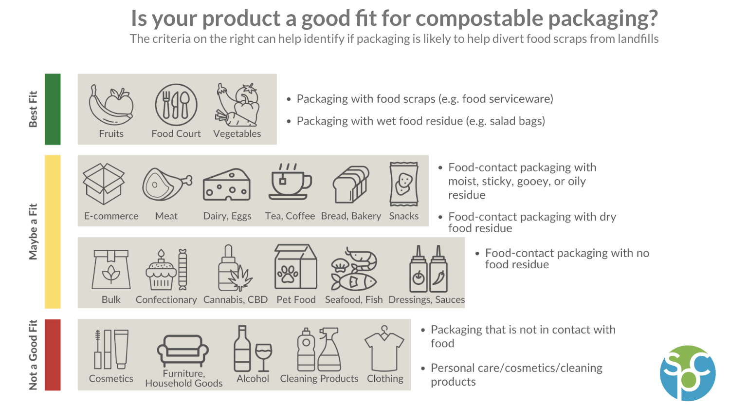 Packaging for non-food purposes doesn’t increase the amount of food waste diverted to composters, and thus should be used sparingly. Additionally, leftover product inside (like residues from cleaning products or cosmetics) may not be safe for compost since it will someday be soil. Some composters have raised the issue that if packaging for a lot of non-food items is designed to be compostable then they’ll receive too much packaging relative to food. The influx of compostable packaging may throw off the composters’ chemical balances at their facilities. While composters vary widely in their perspectives on and acceptance of compostable packaging, many composters who accept packaging note that they ultimately want mostly food and yard trimmings and just some packaging.