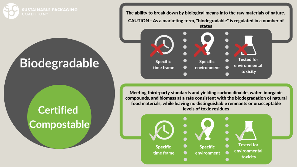 You can check out a summary of the composting certifications in the image below, courtesy of the Sustainable Packaging Coalition (SPC).