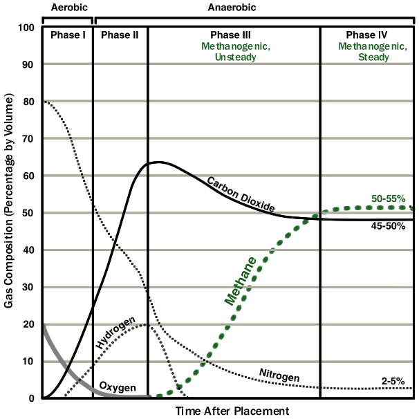 The figure below, presented by the U.S. Environmental Protection Agency (EPA), shows how gases generated by organic material behave in a landfill.