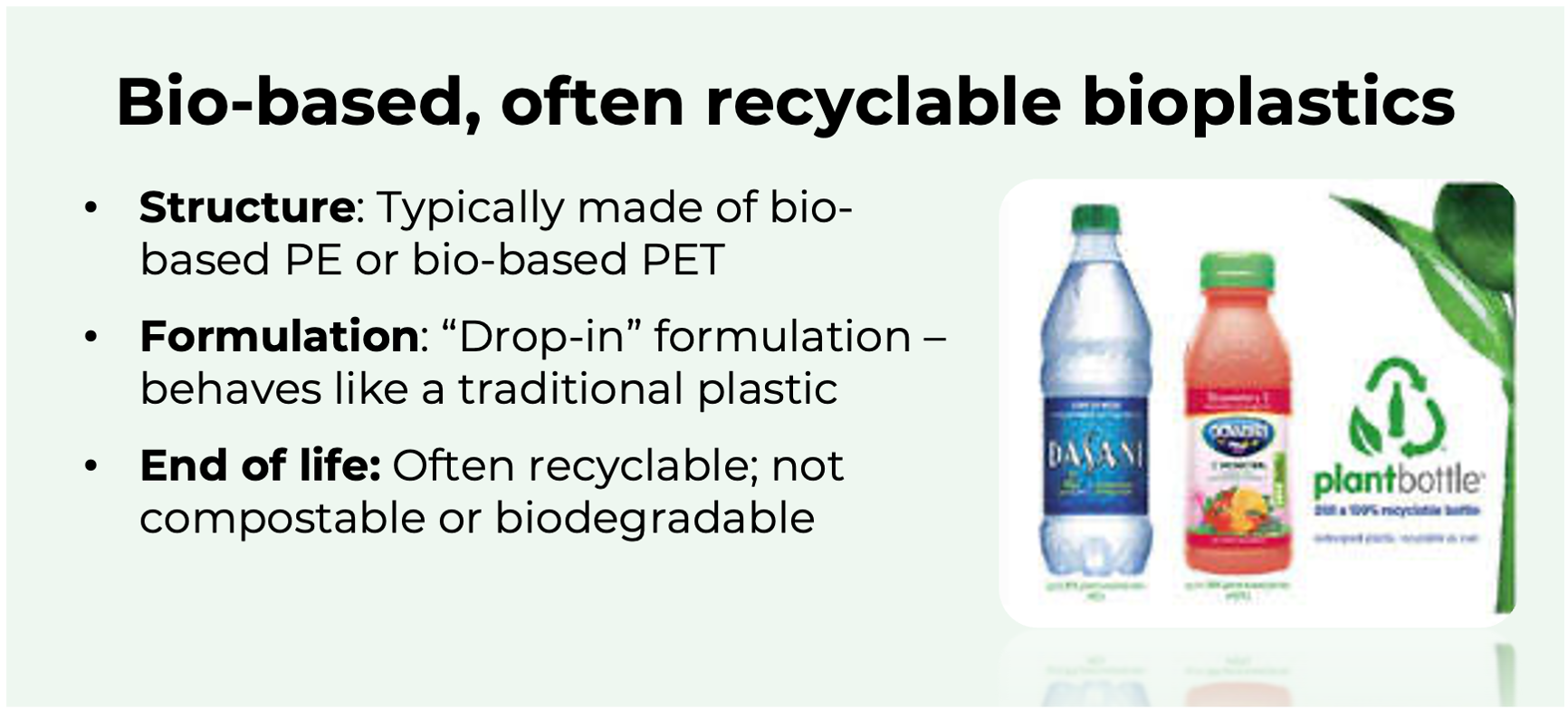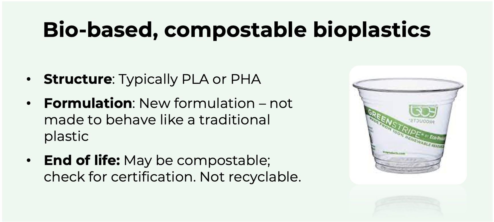 - We discussed that some bioplastics with a “drop-in” formulation, like plant-based PET, can be recycled alongside their petro-based counterparts. However, other compostable bioplastics like PLA, PHA, and PBAT cannot be recycled, and they in fact will have detrimental effects on the recycling stream if they are.