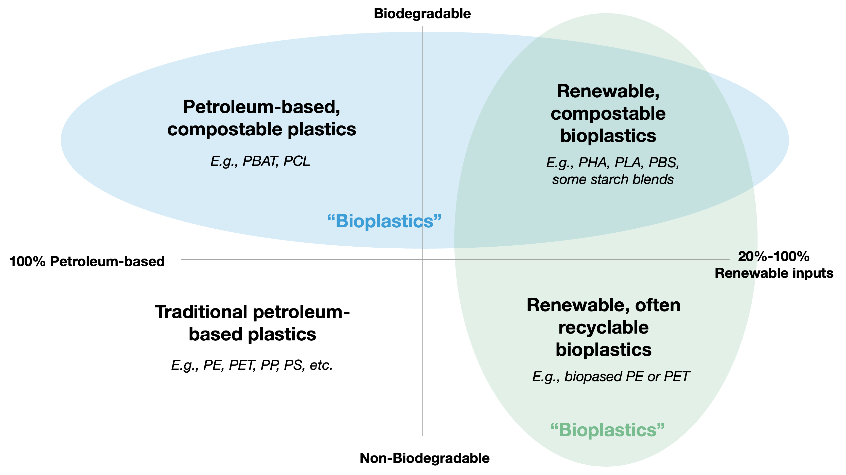 These are the two dimensions we use to understand what exactly is meant by a “bioplastic.”