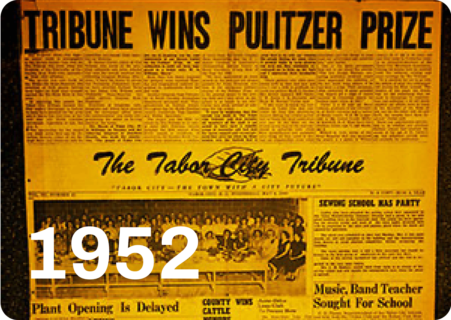 The Tabor City Tribune was awarded the Pulitzer Prize after a two-year campaign of editorials by W. Horace Carter fought to purge the community of the prejudice and violence the KKK promoted. His efforts exposed the Klan and resulted in the imprisonment of several hundred Klan members. This was the first Pulitzer awarded to a weekly newspaper in the history of the prize.